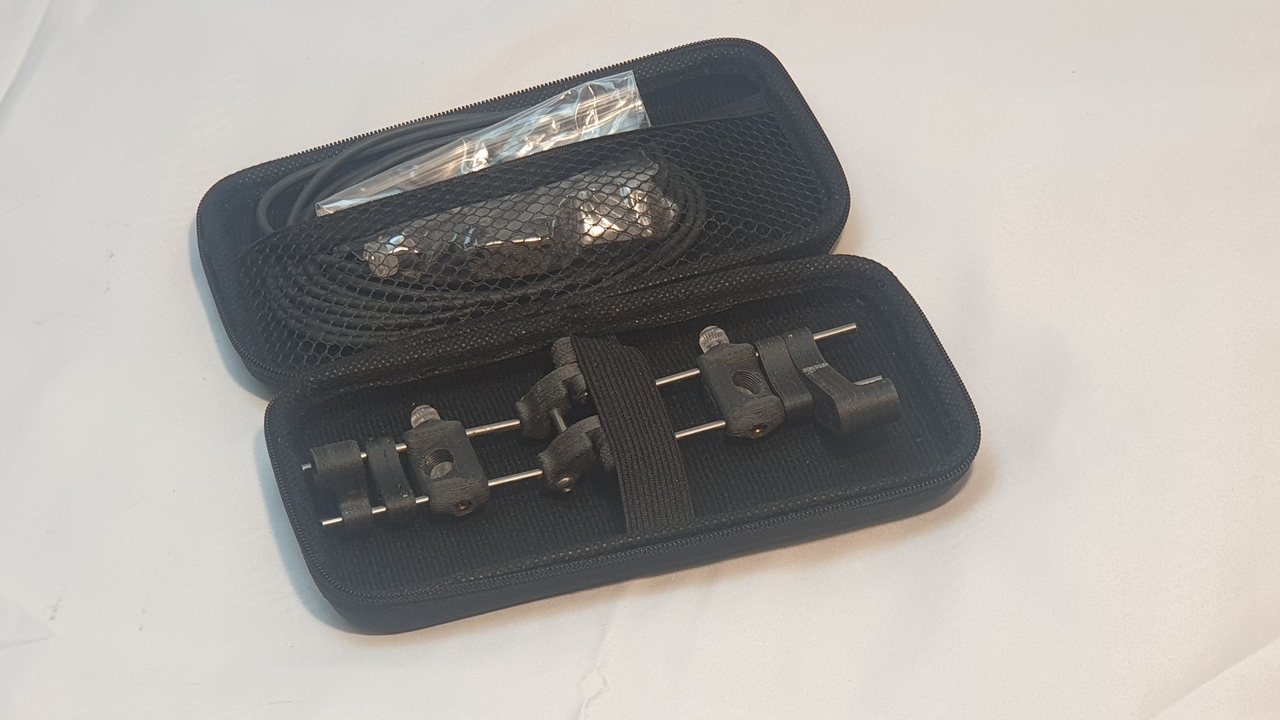 Comes with: Set of 45, 60 and 70 degree wedges; Center Hinge; Extra bars: Magnetic holders; Two encoder mounts; Carry case (About the size of a sunglass case)